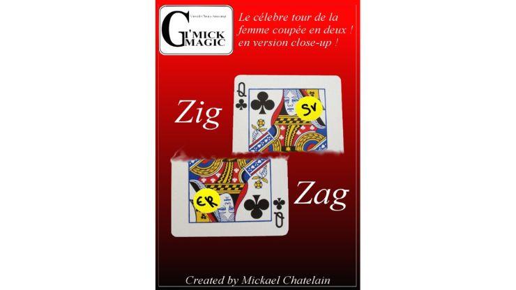 Situez cette carte sur le paquet que vous tenez dans votre main. Puis vous placez la carte magique servant de boite ,vous simulez que vous coupez la carte choisie avec vos doigts en deux ,vous la faites glisser sur le paquet et elle se « »Zig Zag » » devant les yeux du public.