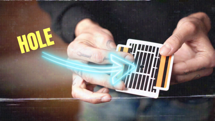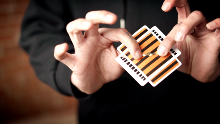 Deux cartes inhabituelles sont présentées. L’une d’entre elles comporte deux fentes ; les deux autres sont percées d’un trou en leur centre. Une attache en laiton est également présentée et s’insère dans le trou. L’une des cartes est enfilée dans les fentes de l’autre, l’attache est passée au centre et les pattes sont pliées vers l’extérieur pour fixer les cartes ensemble. Le spectateur peut tirer sur les cartes pour s’assurer que l’attache passe bien à travers les cartes et les fixe véritablement. D’un geste magique, les cartes s’écartent l’une de l’autre comme si leurs molécules se traversaient l’une l’autre.